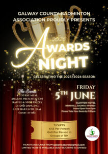 The Galway County Badminton Association is delighted to celebrate another fantastic season and invite you to our 2026 Awards Night! Join us for a brilliant evening recognising the achievements of the 2025/2026 season with great food, awards, music, and dancing. 📅 Friday, 5th June📍 Clayton Hotel, Briarhill, Galway⏰ Doors open 7:00pm (Please be seated by […]
